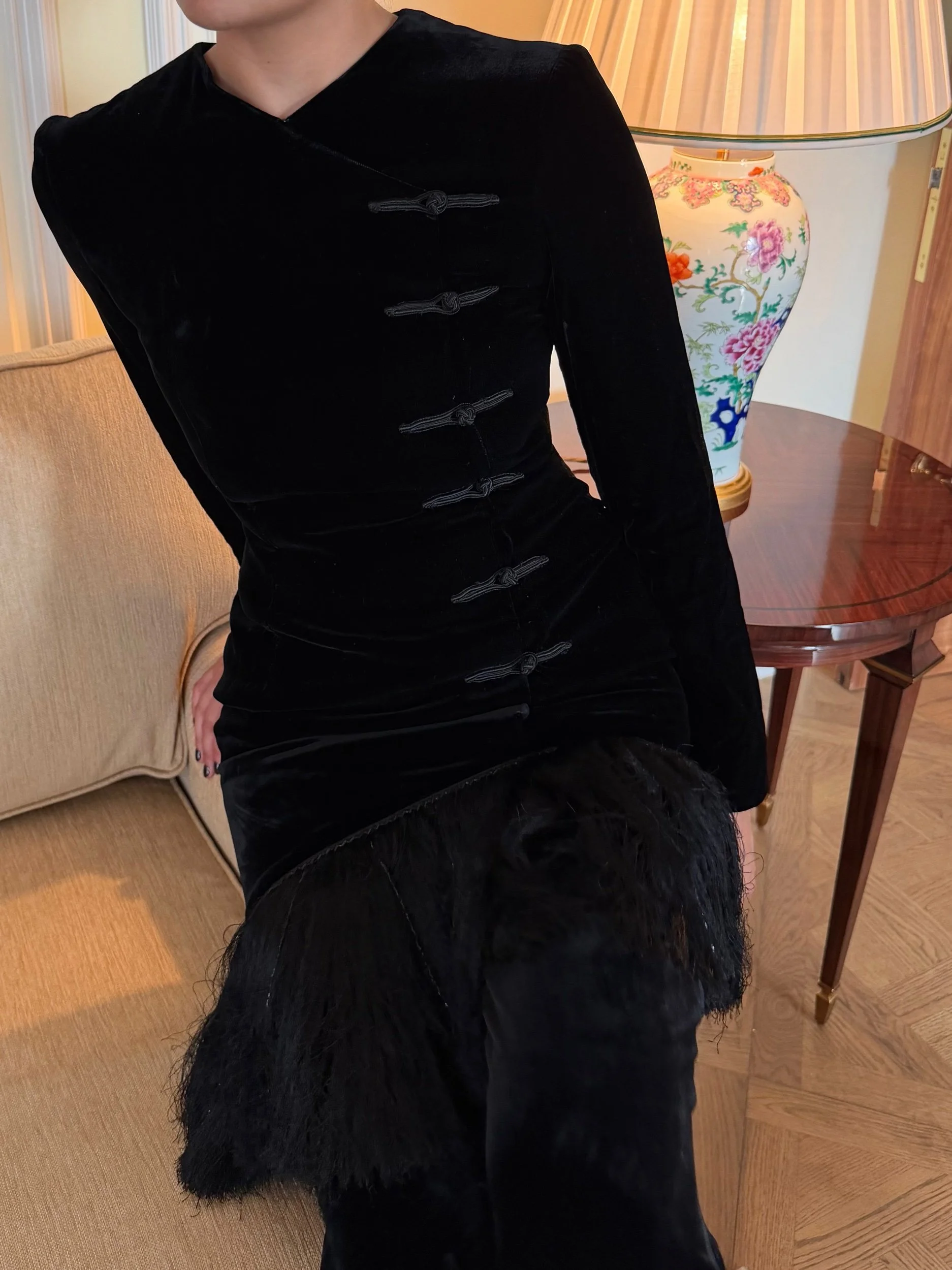 Oscar De La Renta velvet dress, with frog closure detail. Asymmetric fringing. Back zip and zips on cuffs.